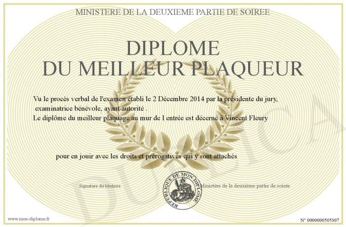 Envoyez par email votre Diplôme du meilleur plaqueur personalisé