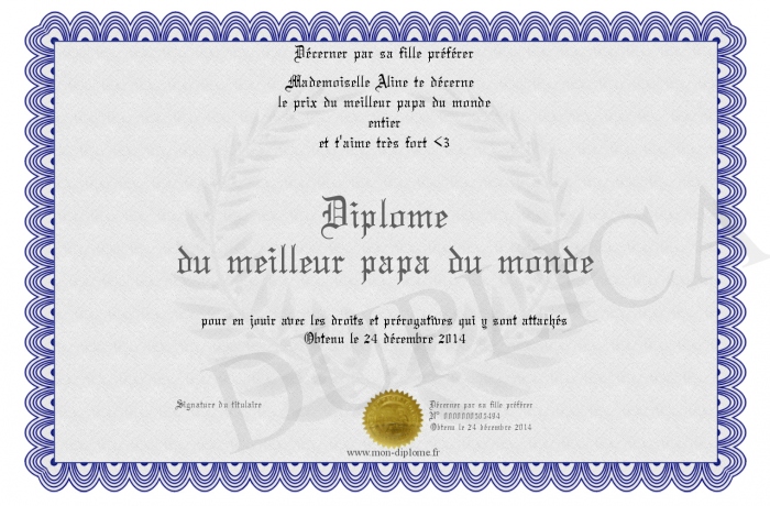Envoyez par email votre Diplome du meilleur papa du monde personalisé