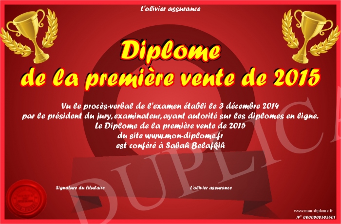 Envoyez par email votre Diplôme de la première vente de 2015 personalisé