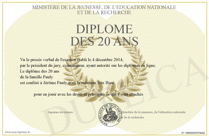 Envoyez par email votre Diplôme des 20 ans personalisé