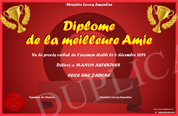 Envoyez par email votre Diplome de la meilleure Amie personalisé