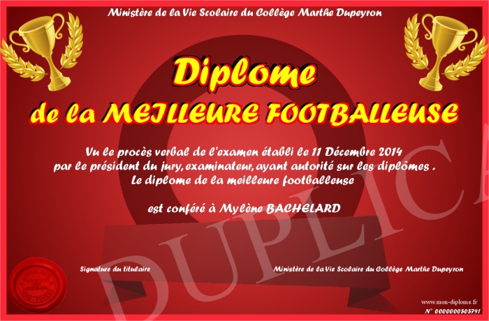 Envoyez par email votre Diplôme de la MEILLEURE FOOTBALLEUSE personalisé