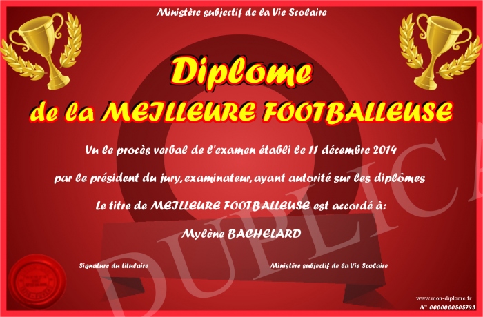 Envoyez par email votre Diplôme de la MEILLEURE FOOTBALLEUSE personalisé