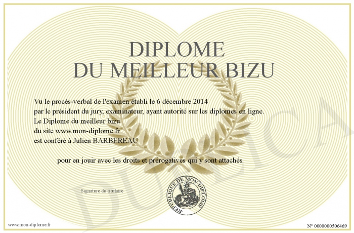 Envoyez par email votre Diplôme du meilleur bizu personalisé