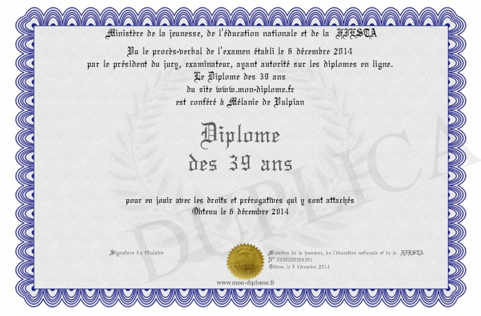 Envoyez par email votre Diplôme des 39 ans personalisé