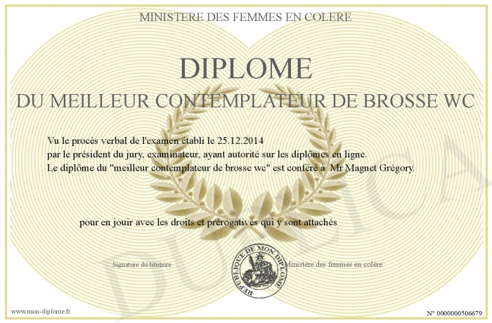Envoyez par email votre diplôme du meilleur contemplateur de brosse wc personalisé