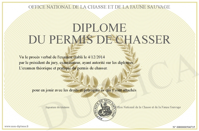 Envoyez par email votre Diplôme du Permis de Chasser personalisé