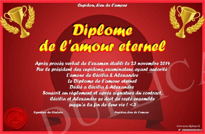 Envoyez par email votre Diplôme de l'amour eternel personalisé
