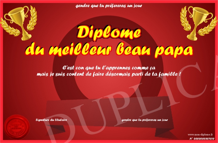 Envoyez par email votre Diplôme du meilleur beau papa personalisé