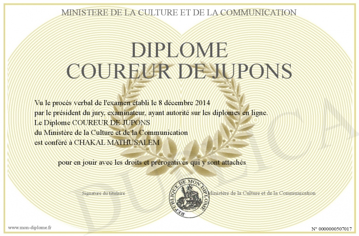 Envoyez par email votre Diplôme COUREUR DE JUPONS personalisé