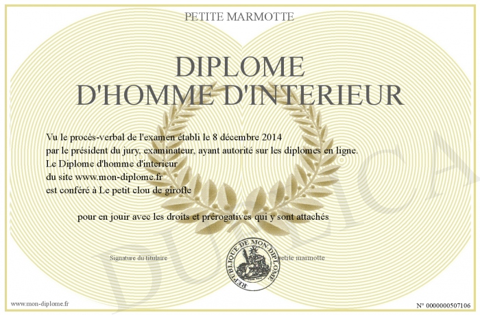 Envoyez par email votre Diplôme d'homme d'interieur personalisé