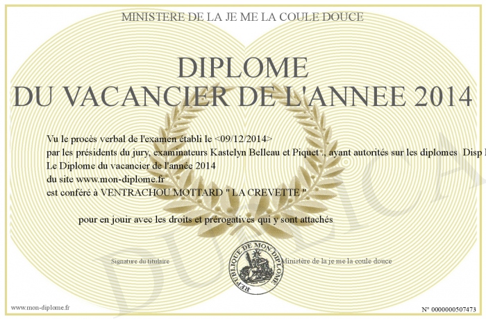 Envoyez par email votre Diplome du vacancier de l'année 2014 personalisé