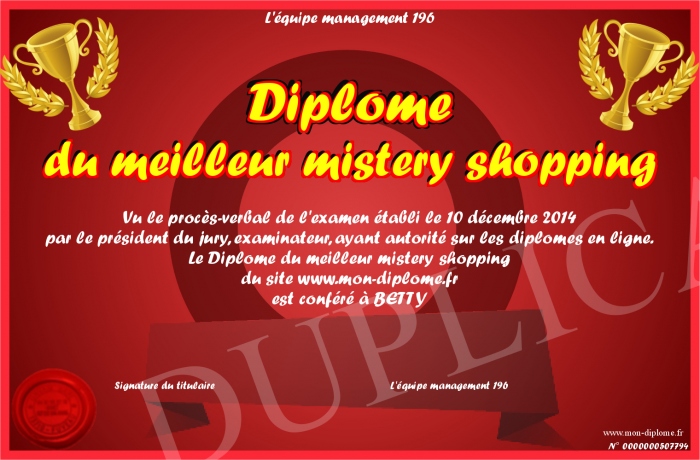 Envoyez par email votre Diplôme du meilleur mistery shopping personalisé