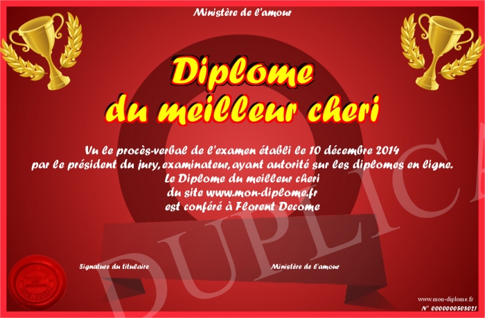 Envoyez par email votre Diplôme du meilleur cheri personalisé