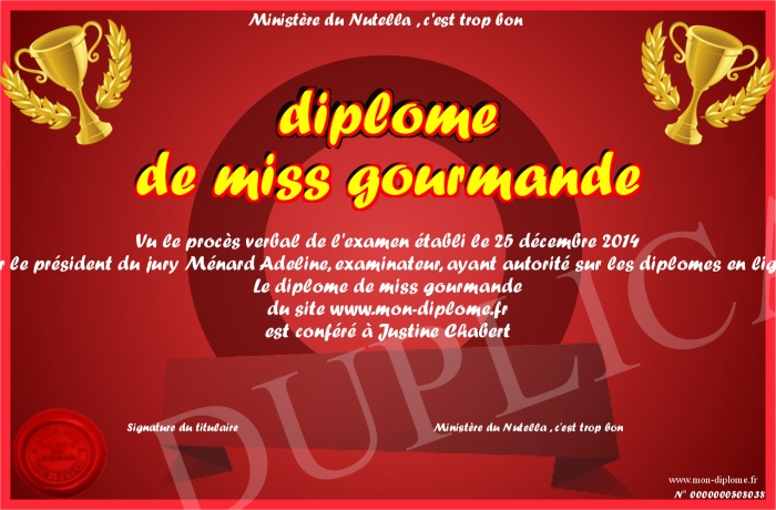 Envoyez par email votre diplome de miss gourmande personalisé