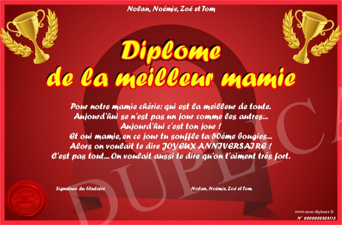 Envoyez par email votre Diplôme de la meilleur mamie personalisé