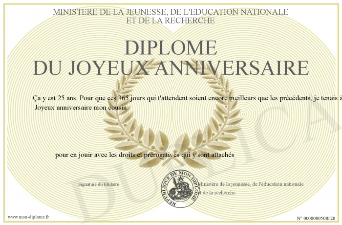 Envoyez par email votre Diplôme du Joyeux anniversaire personalisé