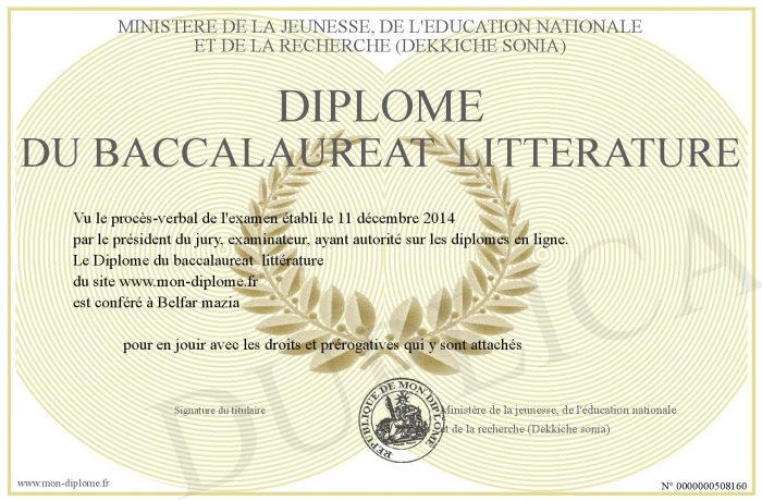 Envoyez par email votre Diplôme du baccalaureat littérature personalisé