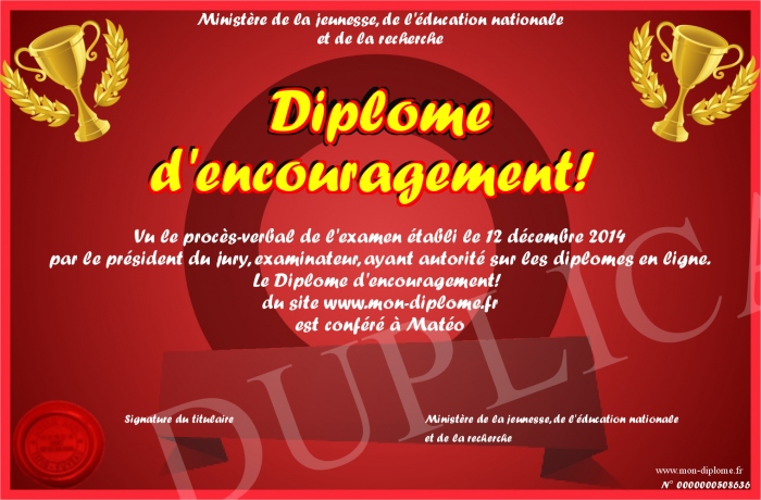 Envoyez par email votre Diplôme d'encouragement! personalisé