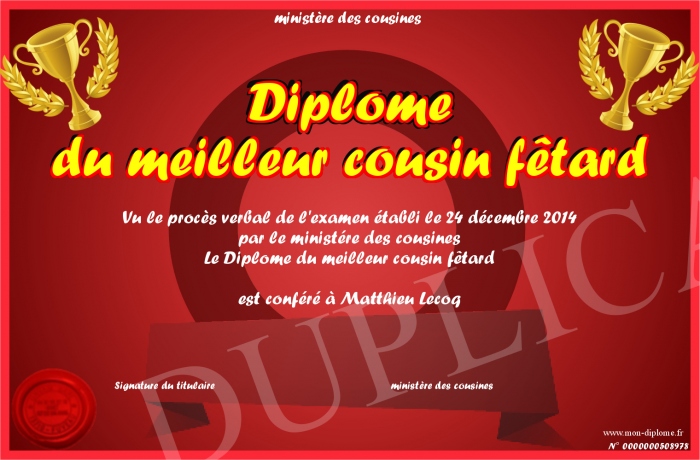 Envoyez par email votre Diplôme du meilleur cousin fêtard personalisé