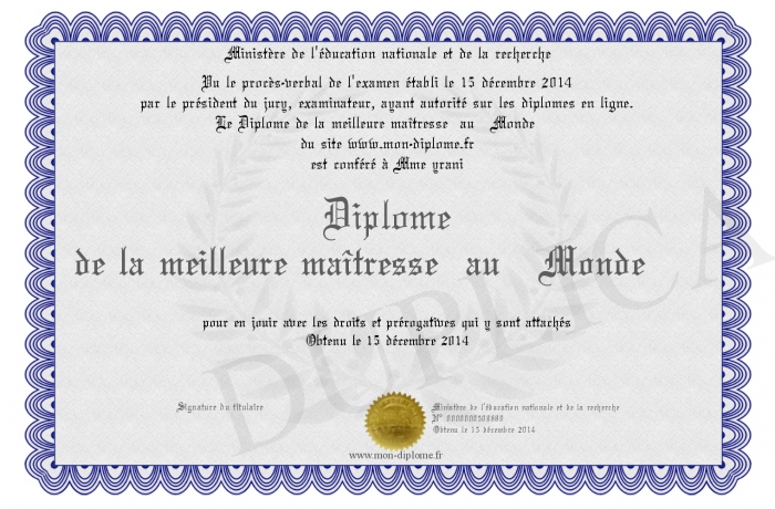 Envoyez par email votre Diplôme de la meilleure maîtresse au Monde personalisé