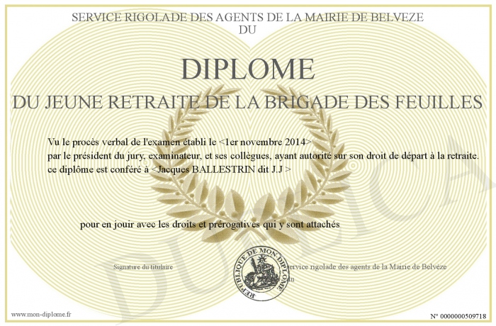 Envoyez par email votre Diplôme du Jeune Retraité de la Brigade des Feuilles personalisé