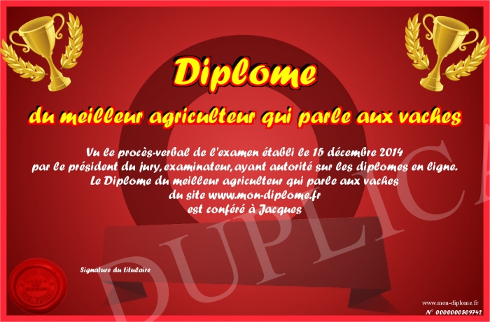 Envoyez par email votre Diplôme du meilleur agriculteur qui parle aux vaches personalisé