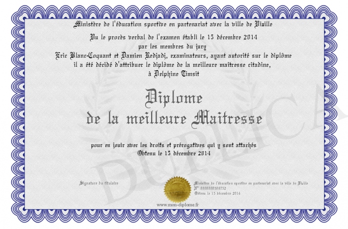 Envoyez par email votre Diplome de la meilleure Maitresse personalisé