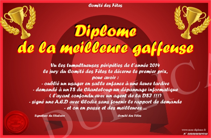 Envoyez par email votre Diplôme de la meilleure gaffeuse personalisé