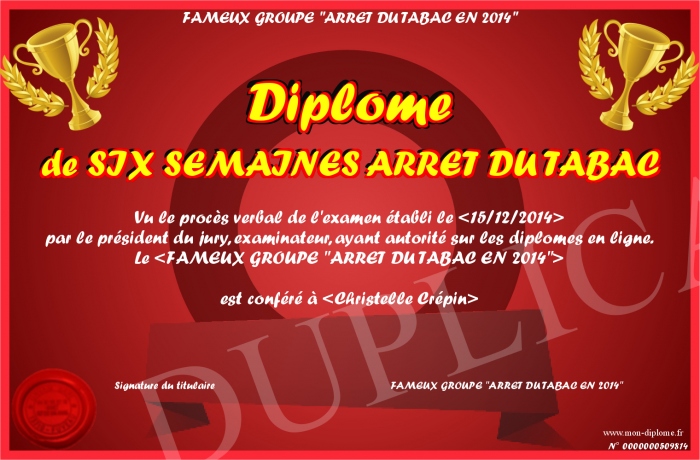 Envoyez par email votre Diplôme de SIX SEMAINES ARRET DU TABAC personalisé