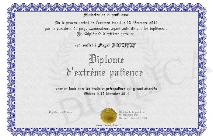 Envoyez par email votre Diplôme d'extrême patience personalisé