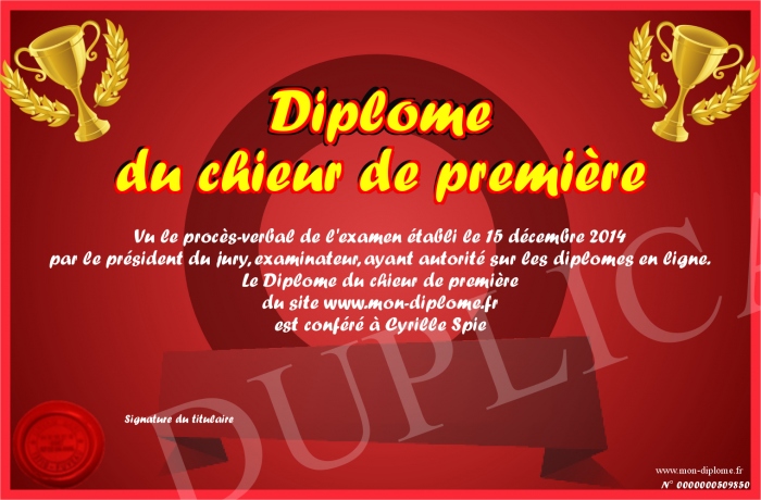 Envoyez par email votre Diplôme du chieur de première personalisé