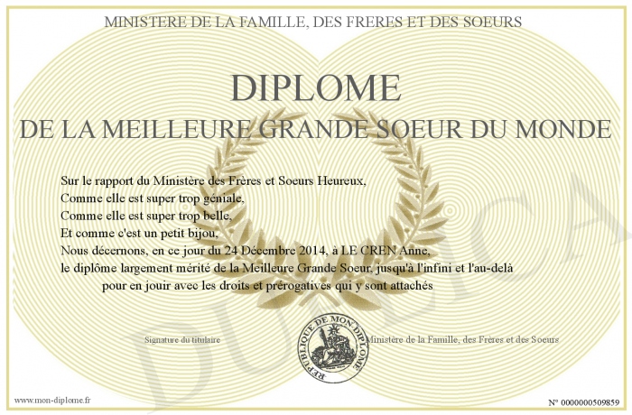 Envoyez par email votre Diplôme de la Meilleure Grande Soeur du Monde personalisé