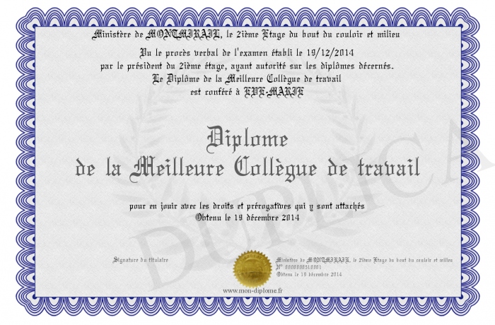 Envoyez par email votre Diplôme de la Meilleure Collègue de travail personalisé