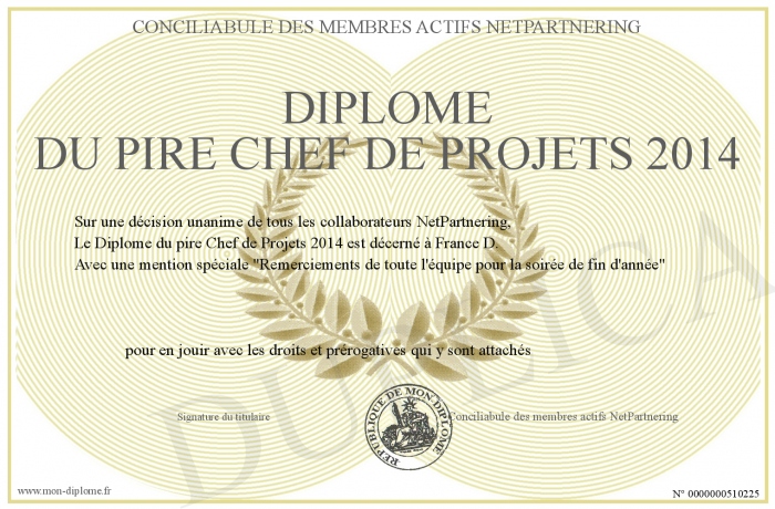 Envoyez par email votre Diplôme du pire Chef de Projets 2014 personalisé