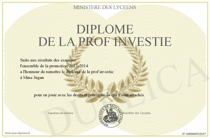 Envoyez par email votre Diplôme de la prof investie personalisé