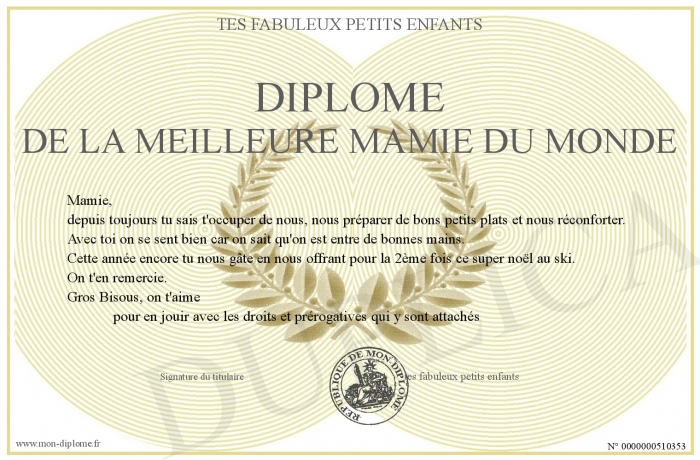 Envoyez par email votre Diplôme de la meilleure mamie du monde personalisé