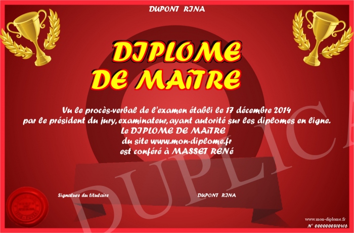 Envoyez par email votre DIPLOME DE MAîTRE personalisé