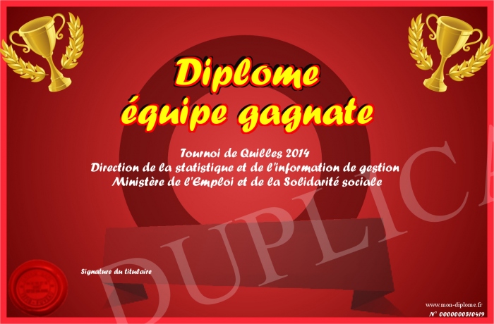 Envoyez par email votre Diplôme équipe gagnate personalisé