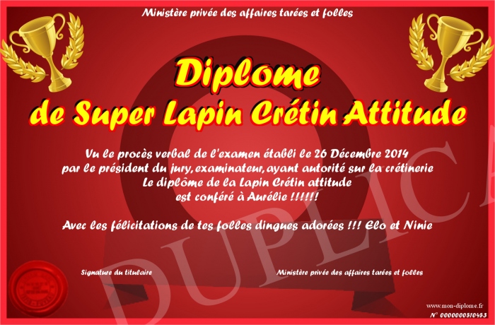Envoyez par email votre Diplôme de Super Lapin Crétin Attitude personalisé