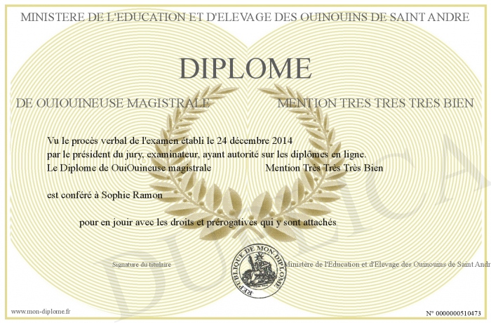 Envoyez par email votre Diplôme de OuiOuineuse magistrale Mention Très Très Très Bien personalisé