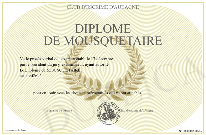 Envoyez par email votre Diplôme de Mousquetaire personalisé