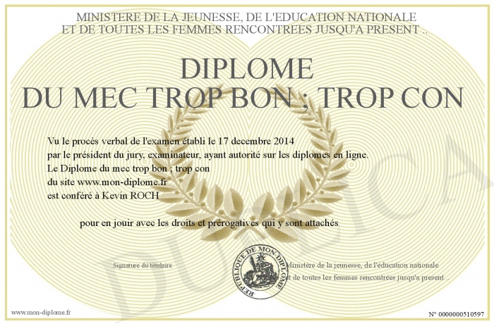 Envoyez par email votre Diplôme du mec trop bon ; trop con personalisé