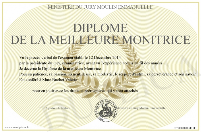Envoyez par email votre Diplôme de La Meilleure Monitrice personalisé