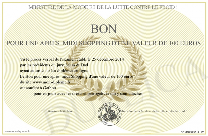 Envoyez par email votre Bon pour une après midi Shopping d'une valeur de 100 euros personalisé
