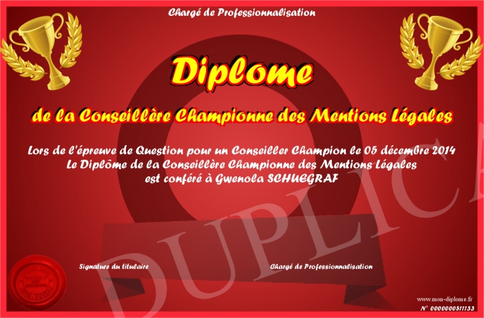 Envoyez par email votre Diplôme de la Conseillère Championne des Mentions Légales personalisé