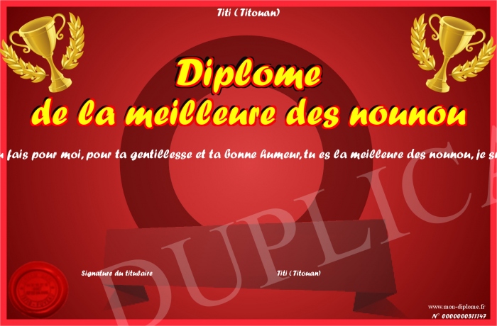 Envoyez par email votre Diplôme de la meilleure des nounou personalisé