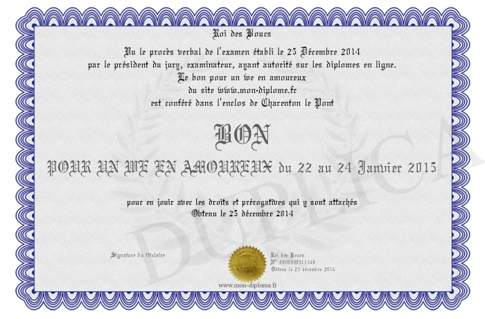 Envoyez par email votre BON POUR UN WE EN AMOUREUX du 22 au 24 Janvier 2015 personalisé