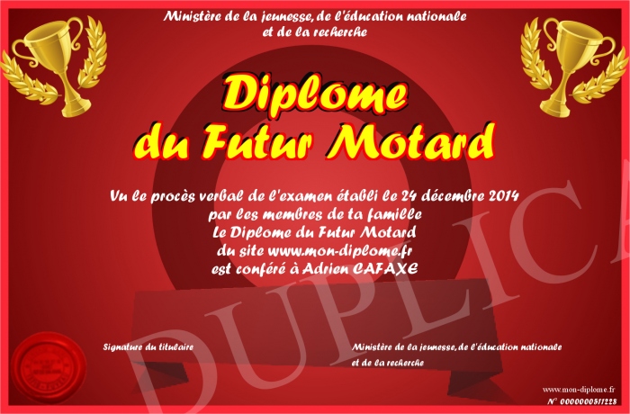 Envoyez par email votre Diplôme du Futur Motard personalisé
