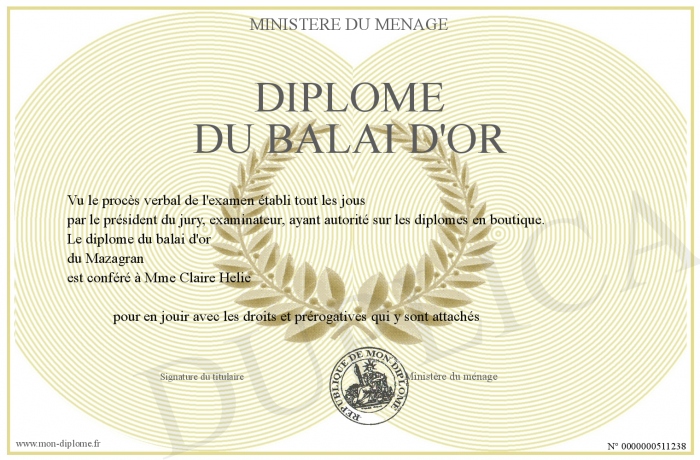 Envoyez par email votre Diplôme du Balai D'or personalisé